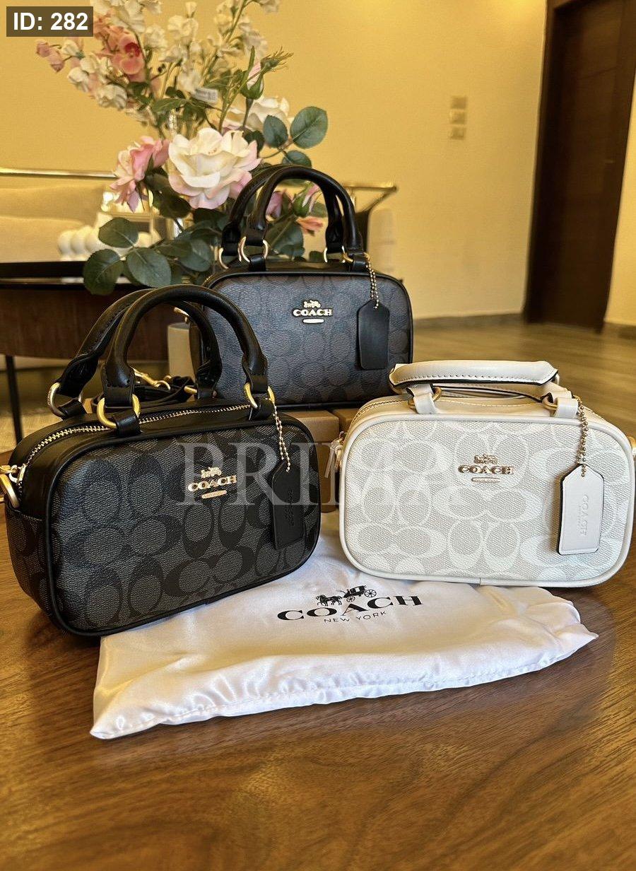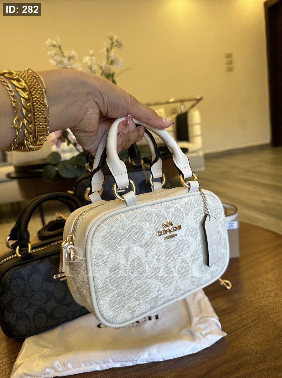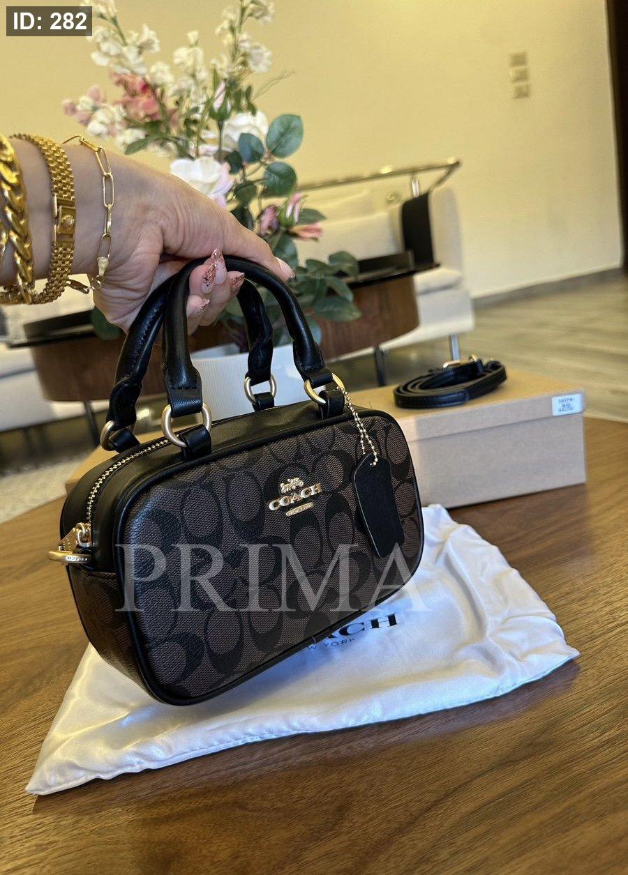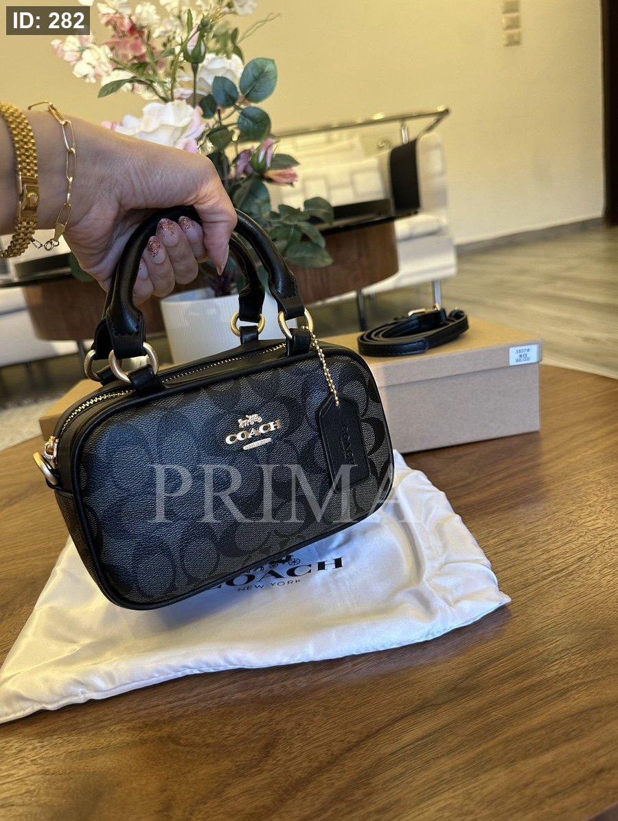 حقيبة يد صغيرة من كوتش مستطيلة الشكل مع مقابض علوية قصيرة وحزام كتف قابل للإزالة. تتميز الحقائب بنقشة شعار "كوتش" المتكرر.مختومة فل باكج قادة 19 سم