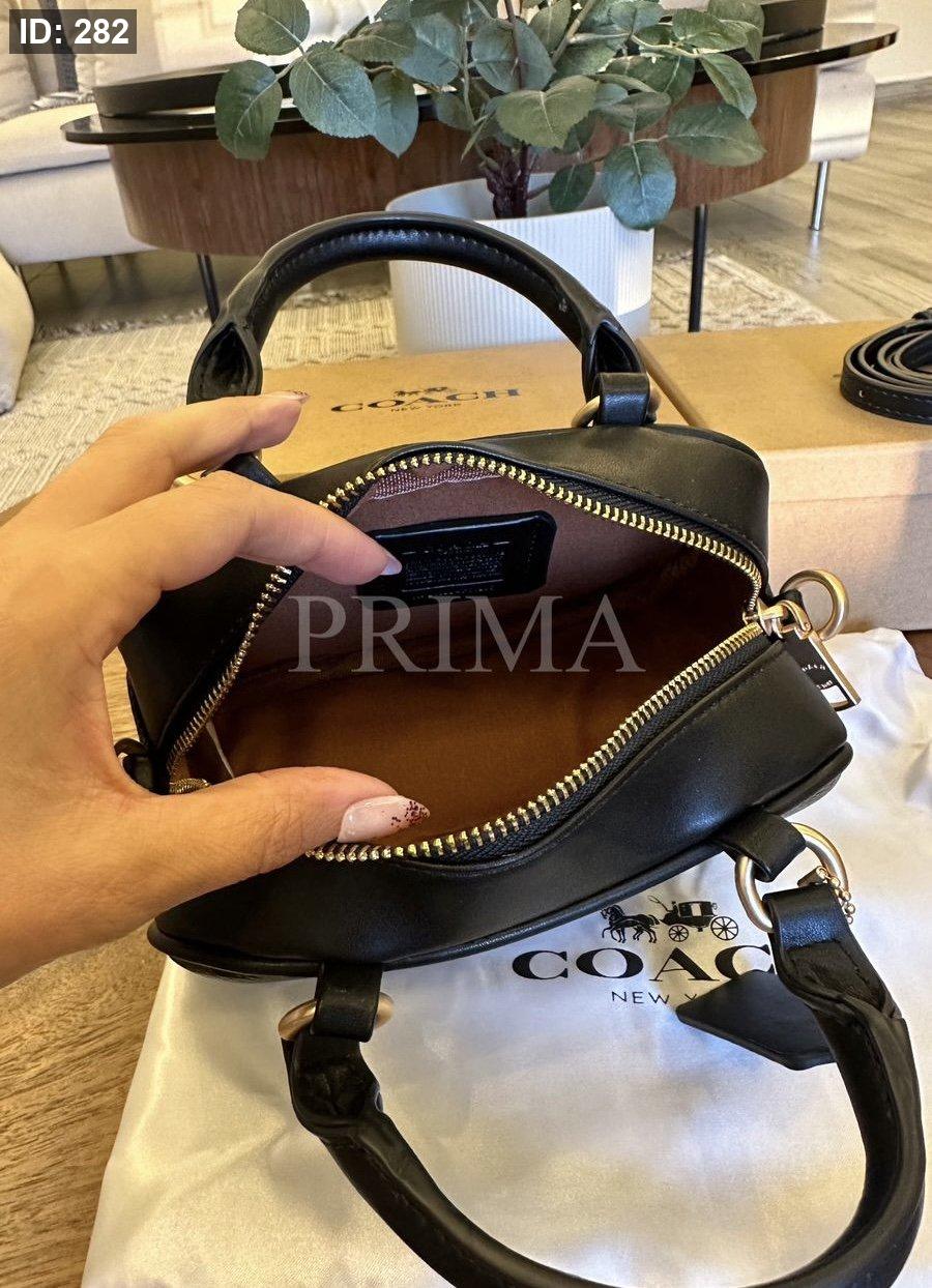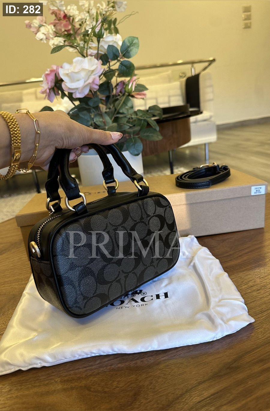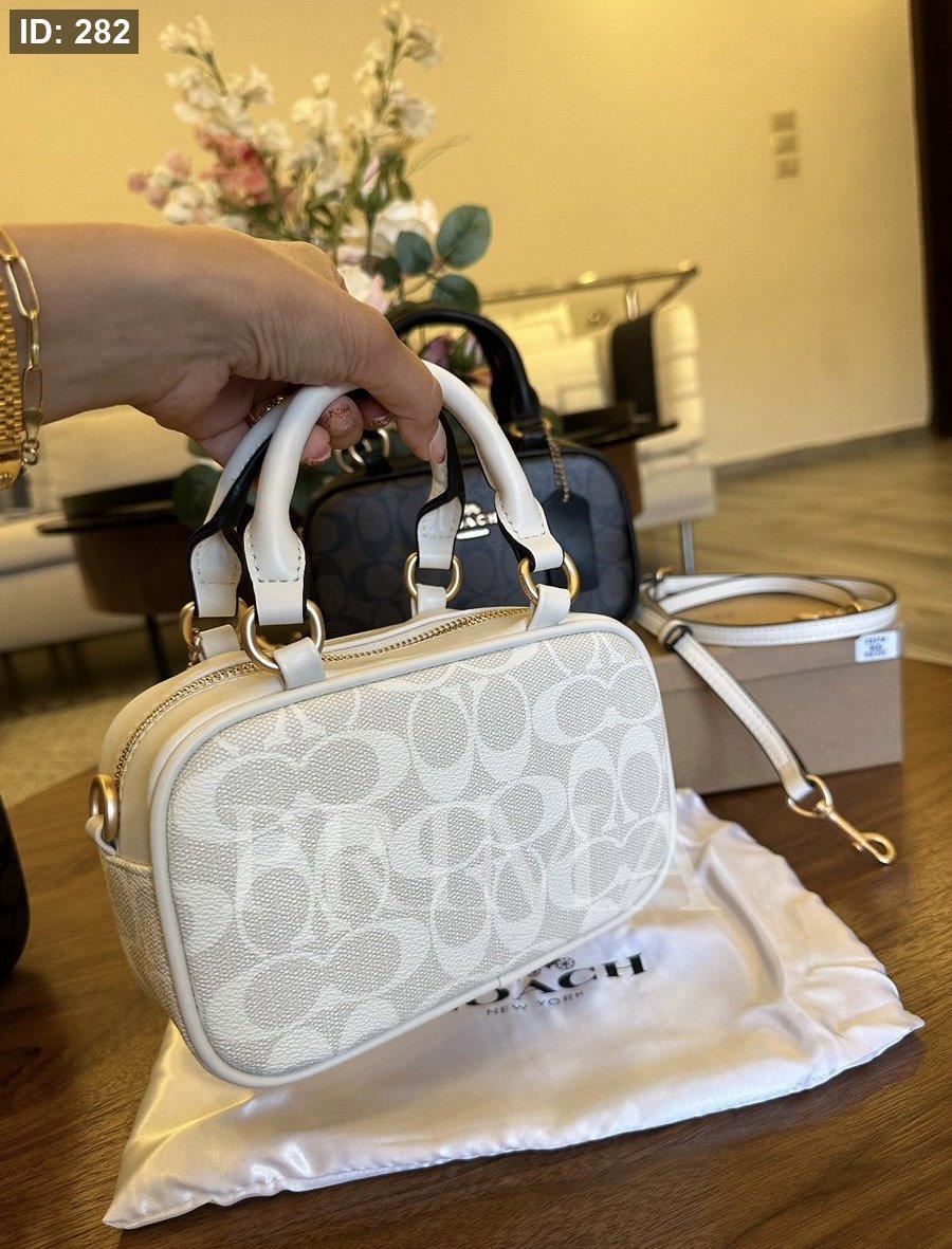 حقيبة يد صغيرة من كوتش مستطيلة الشكل مع مقابض علوية قصيرة وحزام كتف قابل للإزالة. تتميز الحقائب بنقشة شعار "كوتش" المتكرر.مختومة فل باكج قادة 19 سم