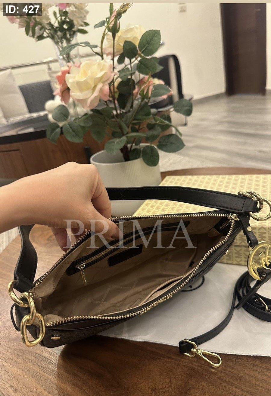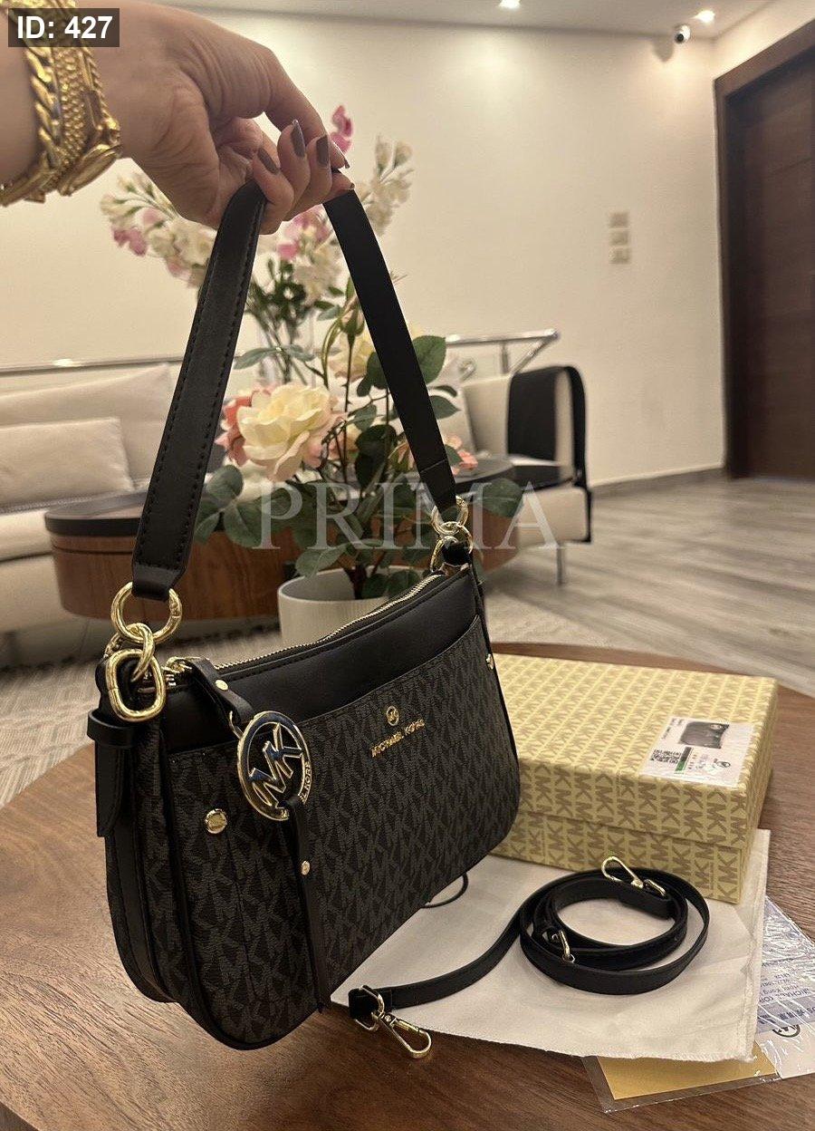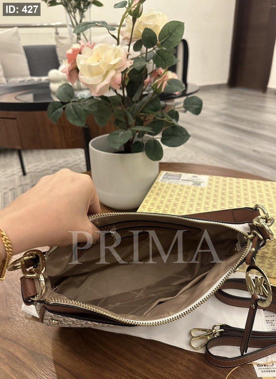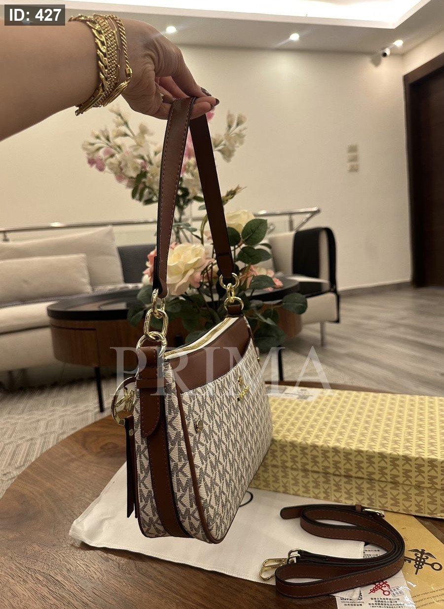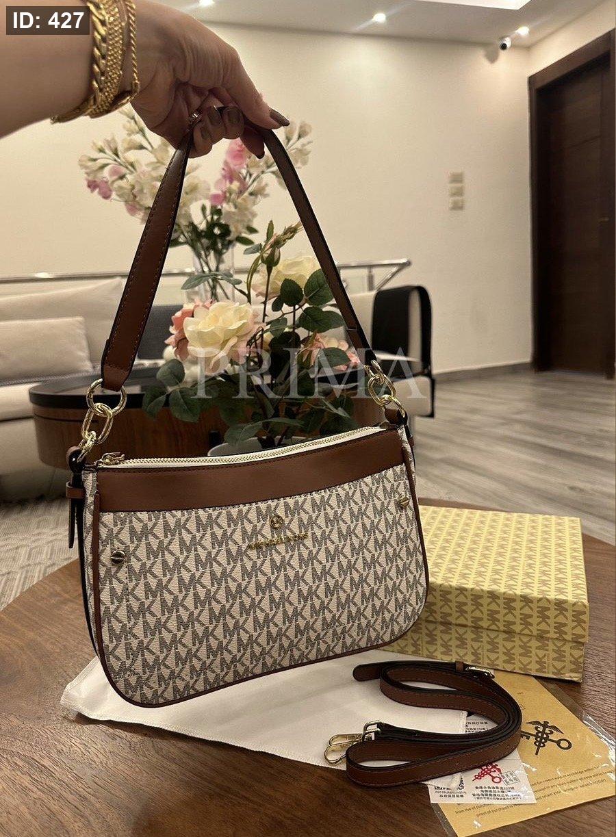 حقيبة كتف من مايكل كورس، وتعرف باسم Michael Kors Logo Jet Set Charm Top Zip Pochette Shoulder Bag. حقيبة كتف صغيرة الحجم وعملية، تتميز بطبعة شعار MK على القماش باللون البيج والأبيض مع جزء علوي من الجلد البني.فل باكج مختومة قاعدة 24 سم