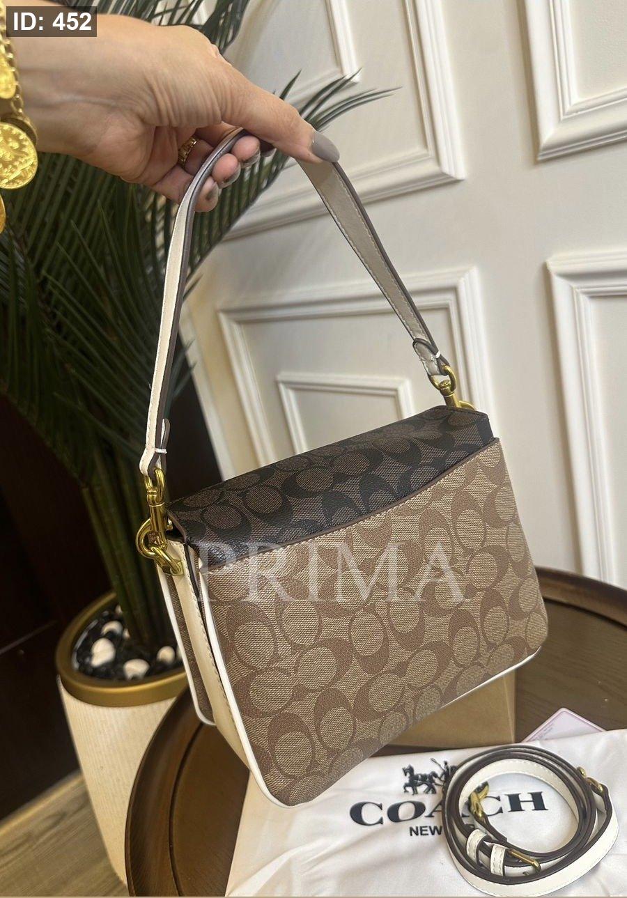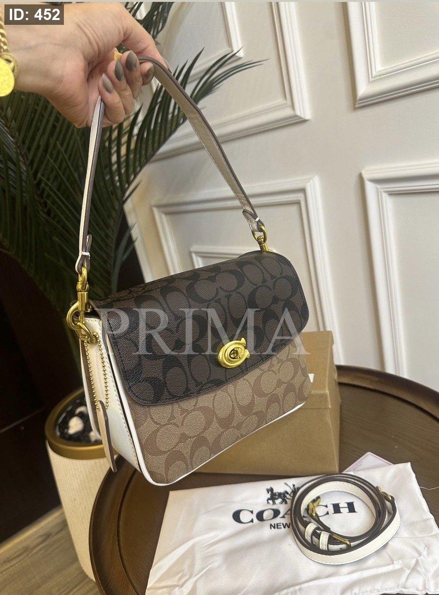 حقيبة كروس بودي من كوتش . تتميز بتصميم عصري وتمزج اللون البني ولون التان من الداخل عدة طبقات مختومة وفل باكج قاعدة 20 سم